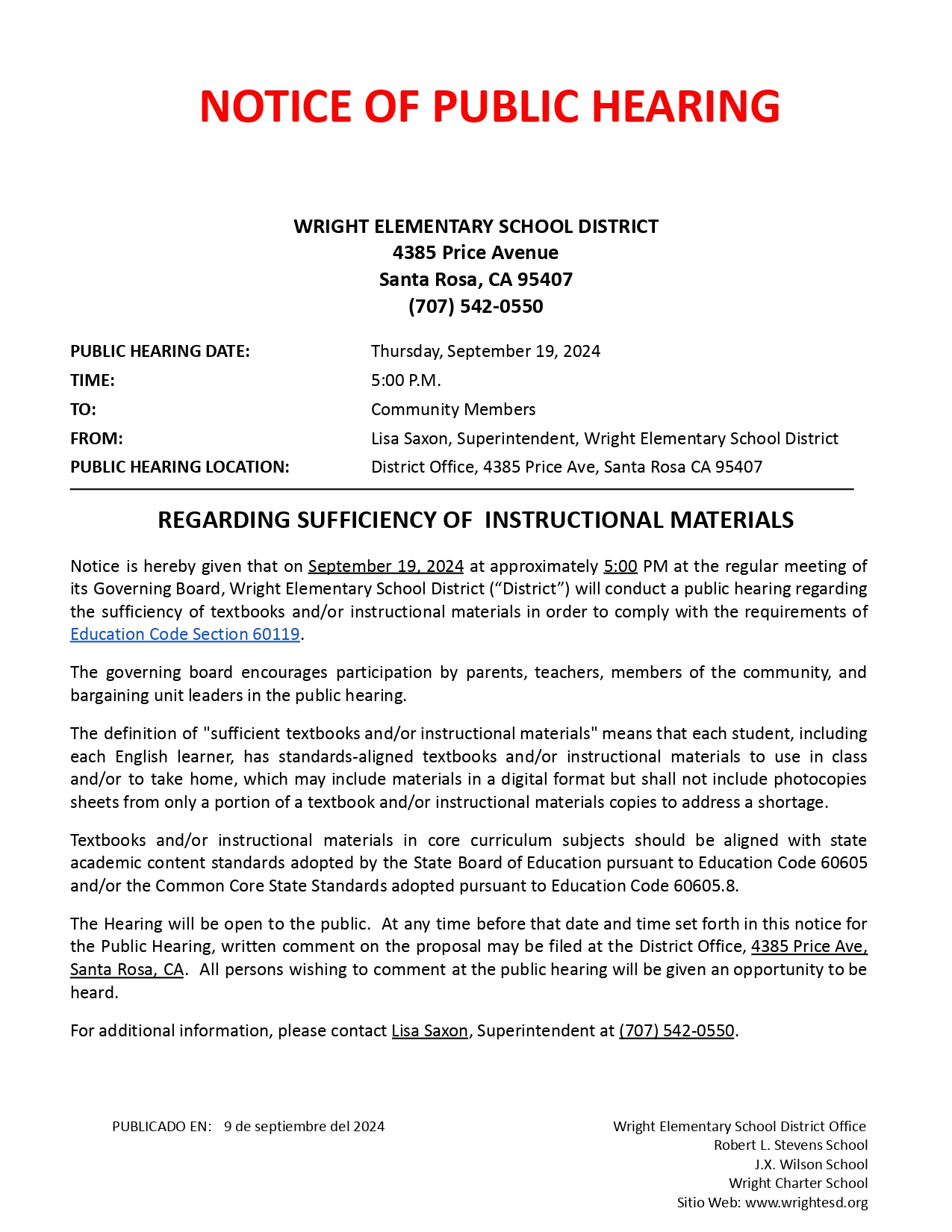 Annual Notice of Public Hearing Regarding the Sufficiency of Instructional Materials for the 2024-2025 School Year: Thursday, Sept. 19, 2024